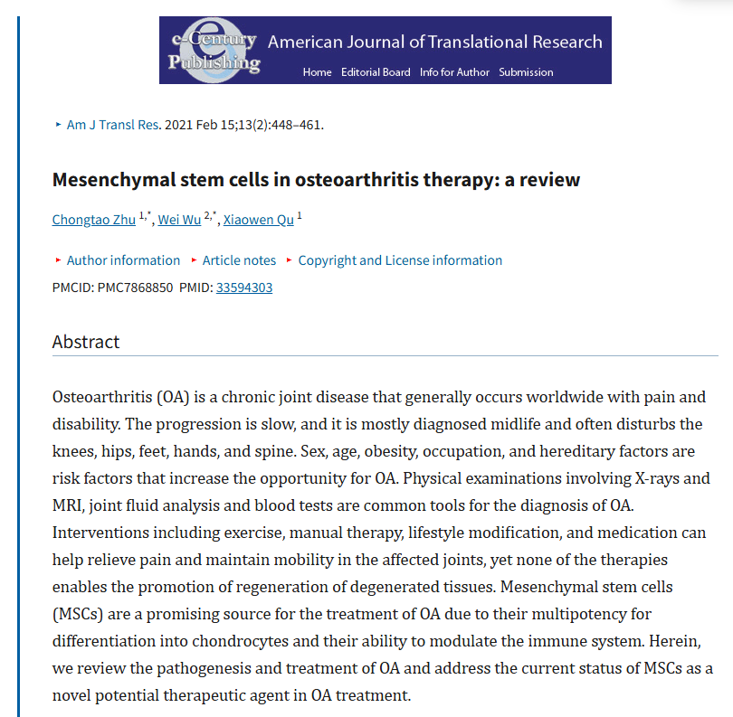 To support our transformative approach, we provide direct access to research articles demonstrating the efficacy of mesenchymal cell (MSCs) therapies in managing and addressing joint pain.